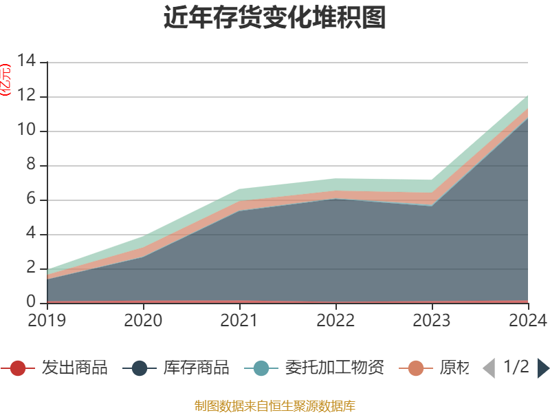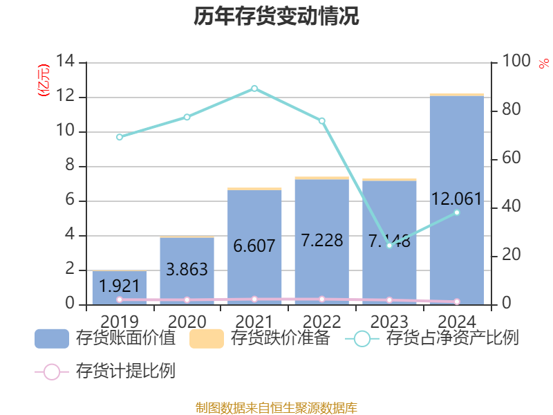 从存货变动来看,截至2024年末,公司存货账面价值为12.06亿元,占净资产的37.92%,较上年末增加4.91亿元。其中,存货跌价准备为1344.95万元,计提比例为1.1%。