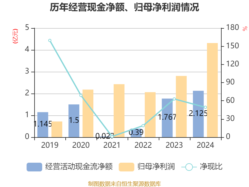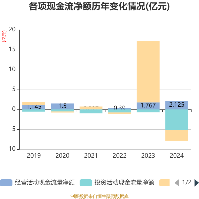 截至2024年,公司经营活动现金流净额为2.12亿元,同比增长20.26%;筹资活动现金流净额-2.64亿元,同比减少18.08亿元;投资活动现金流净额-5.23亿元,上年同期为-7168.19万元。
