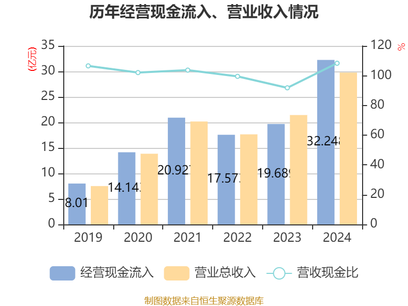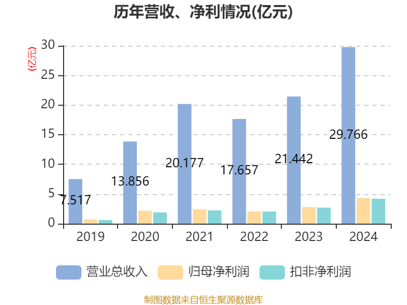 中证智能财讯涛涛车业(301345)4月29日披露2024年年度报告。2024年,公司实现营业总收入29.77亿元,同比增长38.82%;归母净利润4.31亿元,同比增长53.76%;扣非净利润4.21亿元,同比增长55.80%;经营活动产生的现金流量净额为2.12亿元,同比增长20.26%;报告期内,涛涛车业基本每股收益为3.96元,加权平均净资产收益率为14.19%。公司2024年度分配预案为:拟向全体股东每10股派现15元(含税)。