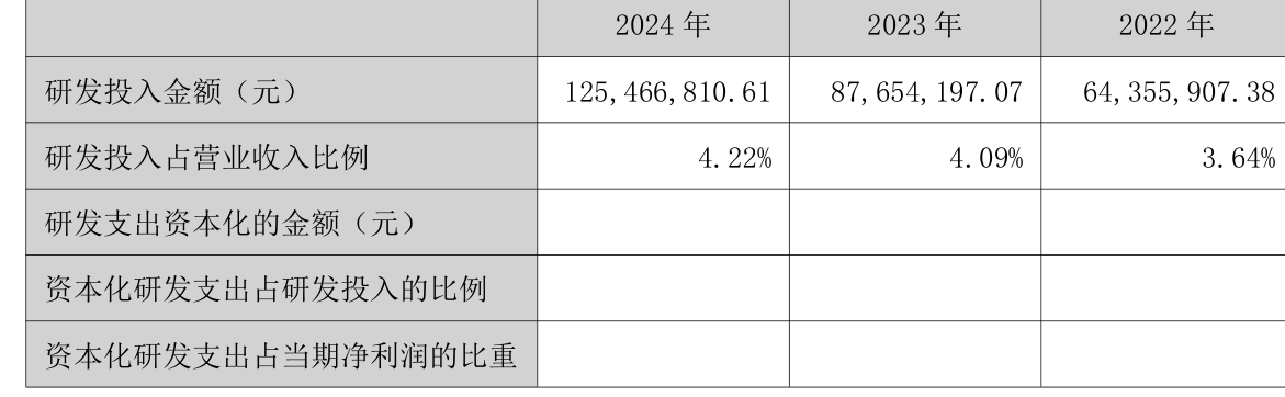 2024年全年,公司研发投入金额为1.25亿元,同比增长43.14%;研发投入占营业收入比例为4.22%,相比上年同期上升0.13个百分点。