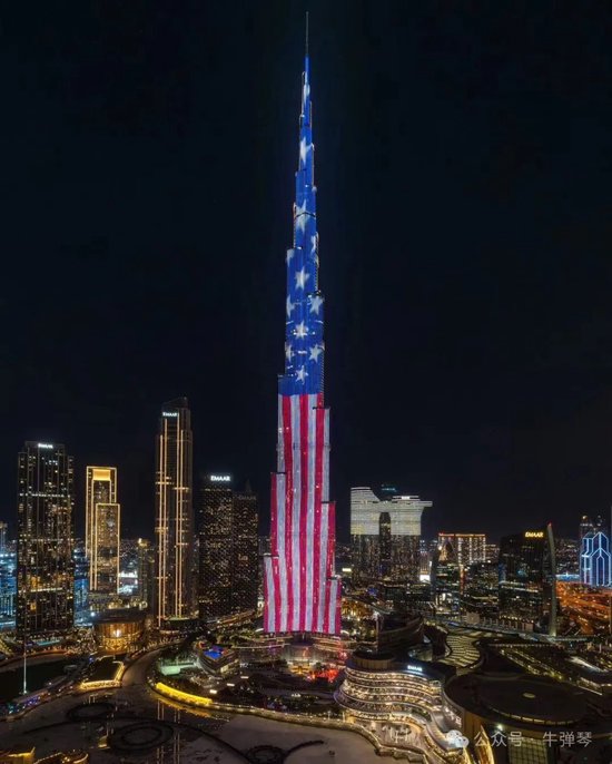 世界最高建筑哈利法塔,都打上星条旗。海湾里的游船,都披上美国色。